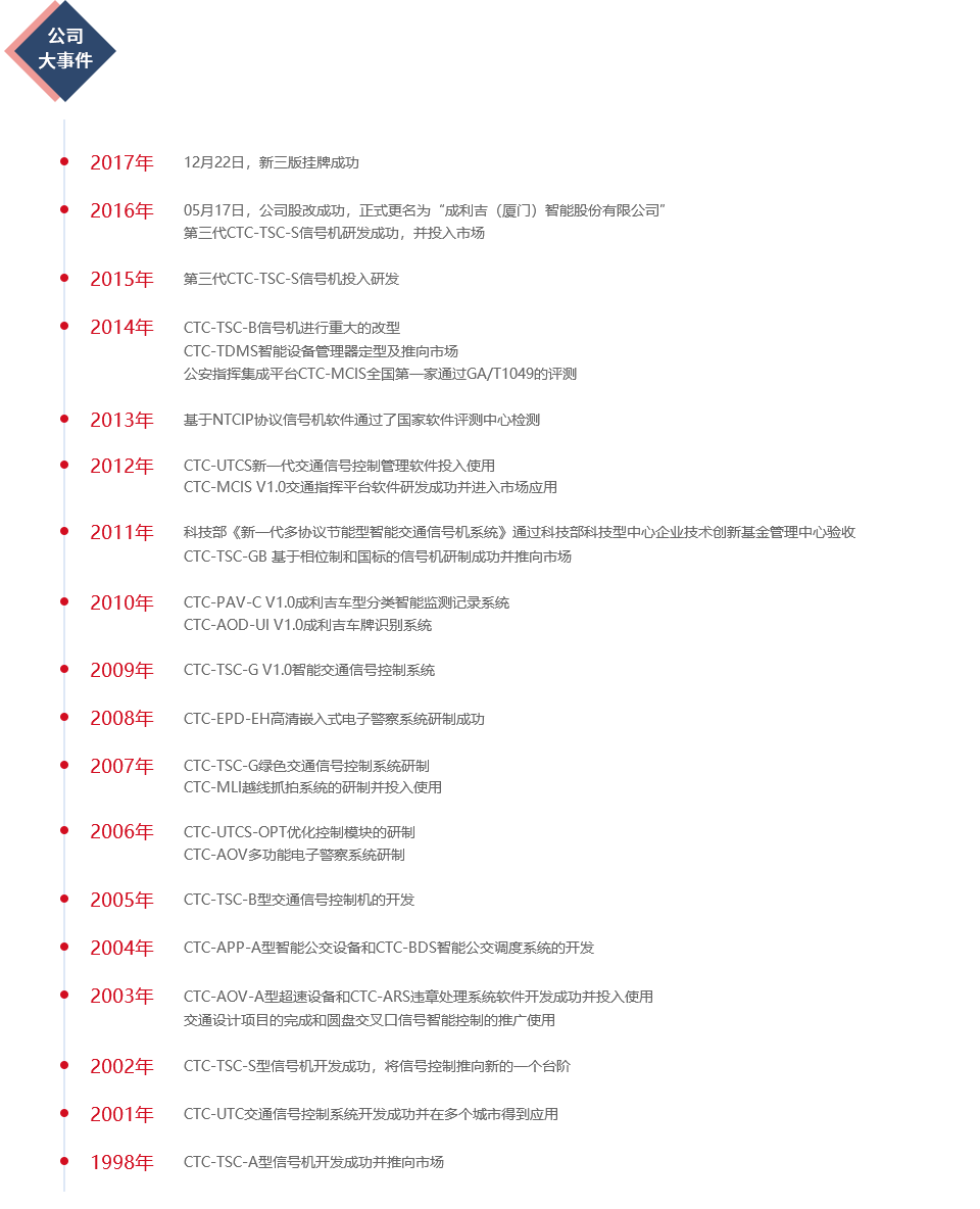 成利吉(廈門)智能股份有限公司,成立于1998年,是國(guó)內(nèi)最早從事智能交通領(lǐng)域產(chǎn)品研發(fā)和應(yīng)用、專業(yè)智能交通核心軟件開(kāi)發(fā)、智能交通系統(tǒng)集成與運(yùn)營(yíng)服務(wù)的企業(yè)之一。公司于2016年5月正式更名為成利吉(廈門)智能股份有限公司,并于2017年12月22日新三版成功掛牌。